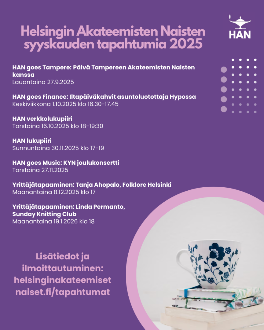 Syyskauden tapahtumien lisätiedot ja ilmoittautuminen kotisivuillamme tapahtumat-sivulla: helsinginakateemisetnaiset.fi/tapahtumat/ Lämpimästi tervetuloa! Lue lisää