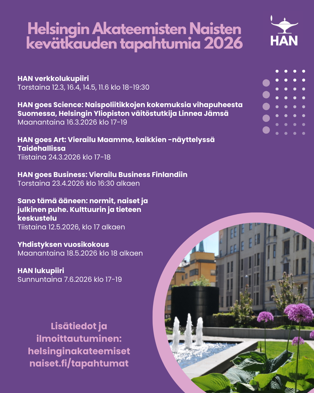 Kevätkauden tapahtumien lisätiedot ja ilmoittautuminen kotisivuillamme tapahtumat-sivulla: helsinginakateemisetnaiset.fi/tapahtumat/ Lämpimästi tervetuloa! Lue lisää